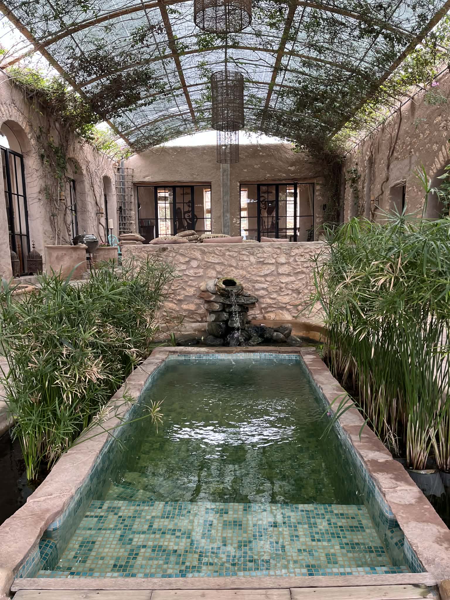 Hoveddelen af huset er arrangeret omkring en central gårdsplads der er skygget af et hvælvet tag af vinstokke. Frøer kalder fra vandfaldet, der plasker ned i en lille og kold, naturlig pool, mens fugle flyver ind og ud af deres reder blandt de raslende vinstokke.